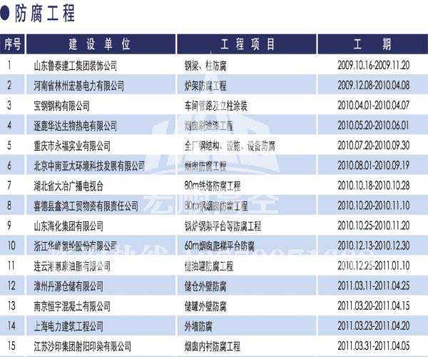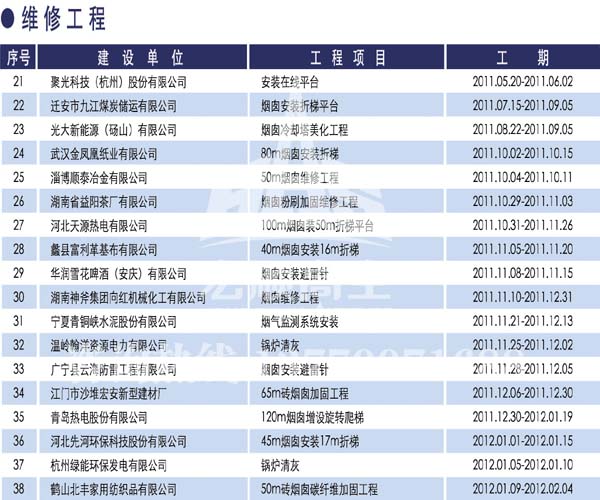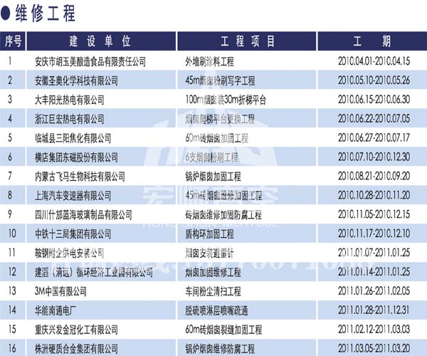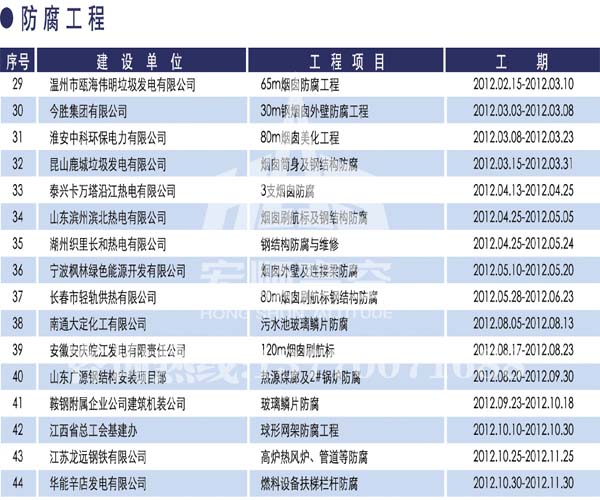 宏順建設(shè)工程有限公司是國(guó)家批準(zhǔn)成立的專業(yè)高空作業(yè)企業(yè):承攬過(guò)(國(guó)內(nèi).國(guó)外)煙囪新建、煙囪防腐、吊機(jī)防腐、水塔防腐、管道防腐、龍門吊防腐、儲(chǔ)存罐防腐、煙囪內(nèi)壁防腐等高空作業(yè)工程。具有“不搭腳手架 、 不需要停產(chǎn)”施工特點(diǎn)。